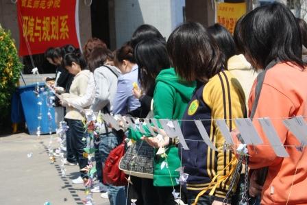 4月14日,我国青海省玉树县发生里氏7.1级地震,受灾严重,一方有难,八方支援,全国各地立即掀起抗震救灾热潮,通过各种形式支援灾区。环境与规划系积极响应学校号召,由团总支协调,晨曦地理协会组织举办了“情系玉树”大型赈灾募捐祈福活动。活动现场,五星红旗高高飘扬,“祖国万岁”四个大字立于图书馆上方,一块块展板生动的反映出全国人民众志成城,抗震救灾的精神。数百张照片真实的再现了玉树灾区地震现场的救援工作及党和国家领导人对人民的亲切关怀。在“玉树不倒,青海长青”横幅上,千余名师生在此留下了自己的姓名,写下了自己的祝福,表达出莘莘学子对灾区人民的祝愿。